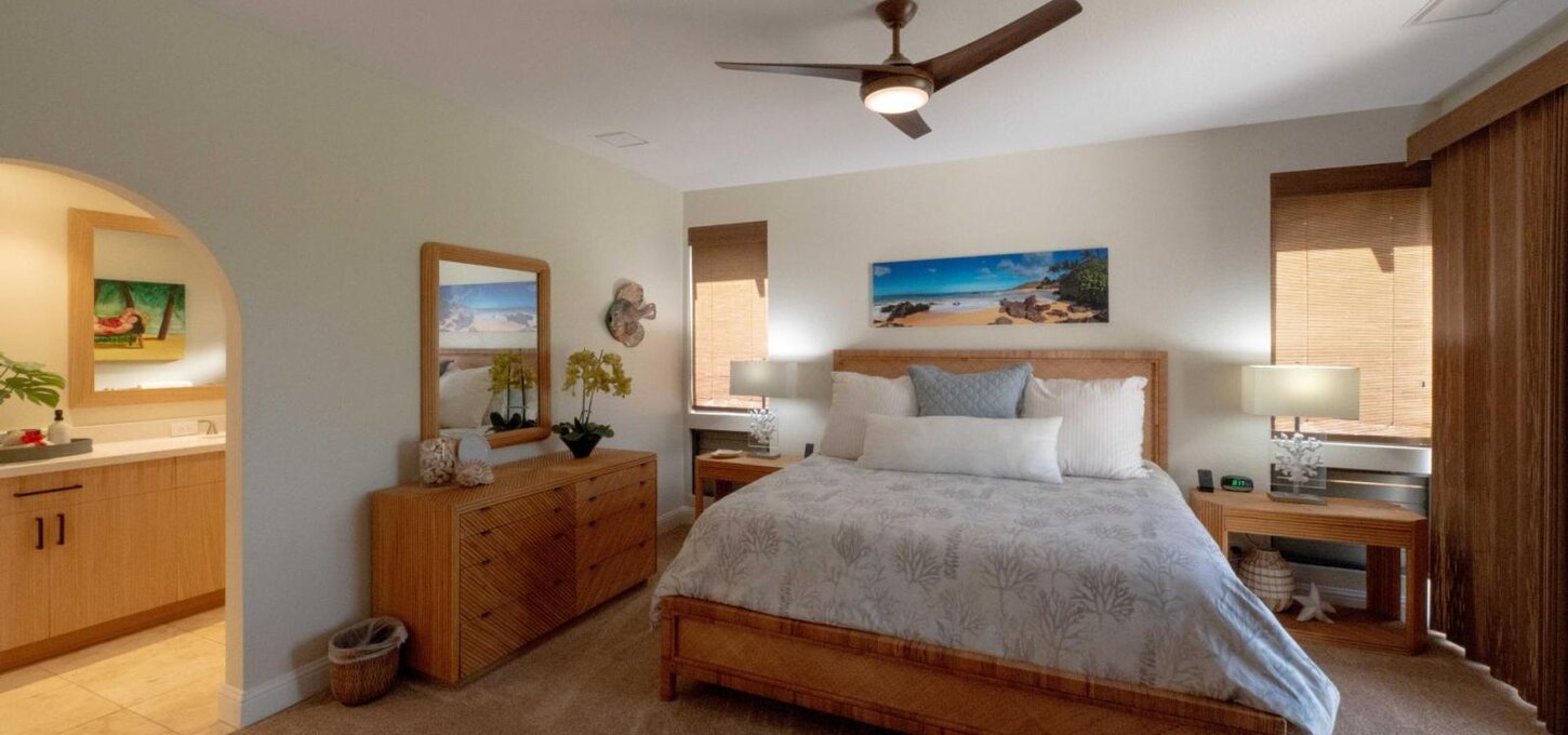 Our upper corner villa offers a panoramic view of the West Maui Mountains as well as the ocean. The villa also overlooks the seventh fairway of the Wailea Blue Course with a short walk or drive to a beach. The huge wrap-around lanai invites you out doors where Mother Nature is your host bringing you, views of the golf course/ocean. Everything in our villa has been carefully chosen to make your stay pleasurable. Tropical colors abound, with beautiful island decor that screams Aloha! Our villa is located in the beautiful Grand Champions complex, located in the heart of Wailea close to resorts, restaurants, beaches and the Shops at Wailea, all close by. Our unit is very spacious; there is 1,360 sq. feet of space in which to relax. W...