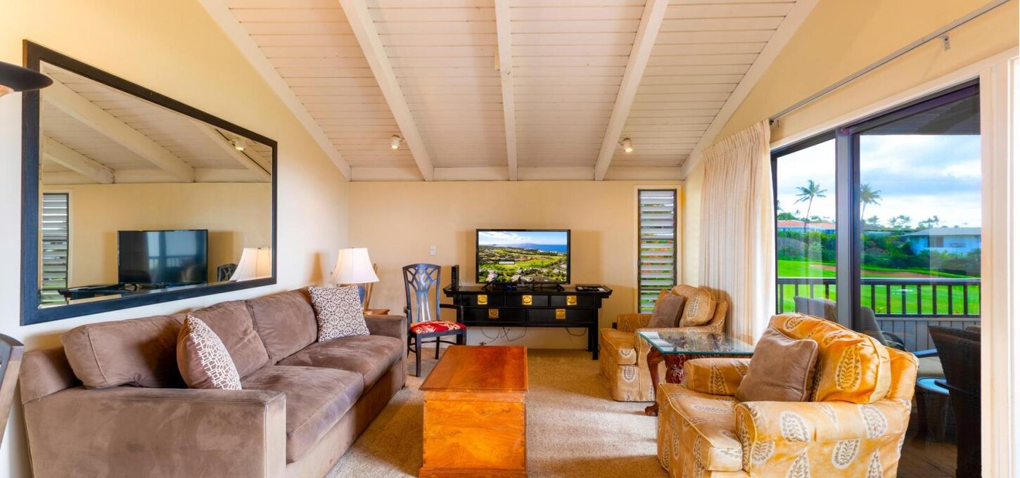 Wailea Ekolu #304 is a luxurious condominium situated at the front row of Ekolu on the 15th hole of the Wailea Blue Course with panoramic views of Molokini and Kahoolawe islands. Every day a new sunset paints a breathtaking picture on the sky. This is an upstairs villa with vaulted ceilings, lots of light, and gorgeous views from every room (ocean views from the lanai, living room, kitchen, and bedroom!). At the front row, you don't see rooftops or the parking lot when you look out. You see the golf course, trees, ocean, and Molokini and Kahoolawe islands. King-size bed (top-of-the-line Simmons Beautyrest Worldclass Felicity Pillowtop mattress) Sleeper sofa in the living room (Crate and Barrel) Large screen TV / DVD Player / DV...